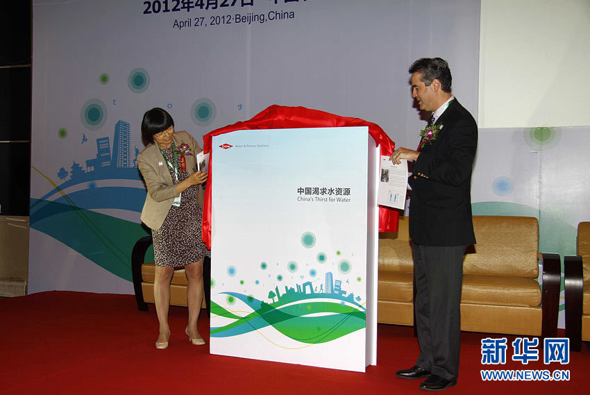 4月28日,首届“水资源管理与城市可持续发展”论坛在京举办。图为陶氏发布《中国渴求水资源》报告揭牌仪式。(新华网发 张璋摄)