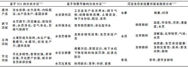研究河流生态系统服务功能,首先应该明确河流生态系统具有哪些服务功能,所以合理的分类是对河流生态系统服务功能进行评估的基础。表1列举了针对河流生态系统服务的主要分类方法。