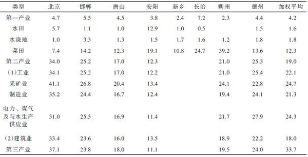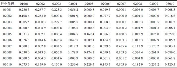 注:1.行业代码:01001,农林牧渔业;02002,食品、饮料制造业;02003,纺织业;02004,造纸及纸制品业;02005,石油加工、炼焦及核燃料加工业;02006,化学工业;02007,金属冶炼及压延加工业;02008,采矿及其他制造业;02009,建筑业;03010,第三产业。2.表中数据为无量纲数据。