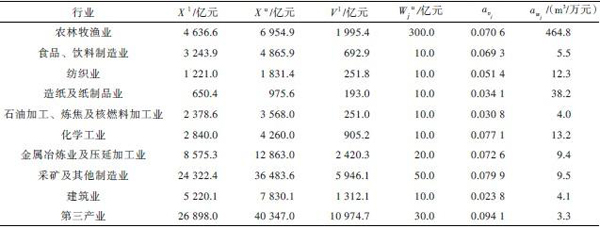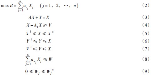 式中:B为国民经济各行业增加值;avj为第j 行业利润率系数,等于本行业营业盈余与总产出的比;Xj为第j 行业总产出;A 为投入产出直接消耗系数矩阵,由n×n个数值构成,其中aij指在生产经营过程中第j 产品(或行业)部门的单位总产出所直接消耗的第i 产品部门生产的货物或服务的价值量;X为各行业总产出列向量;Y为最终产品列向量;A1′为投入产出中间使用系数矩阵的转置矩阵,中间使用系数指某行业产品或服务被其他行业(或部门)使用的价值量;V为各行业增加值列向量;X l为总产出下界列向量;X u为总产出上界列向量;Y l为最终产品下界列向量;V l为增加值下界列向量;awj为第j 行业直接用水系数,等于该行业总用水量与总产出的比;W 为可利用的水资源量;Wju为第j行业用水上限。