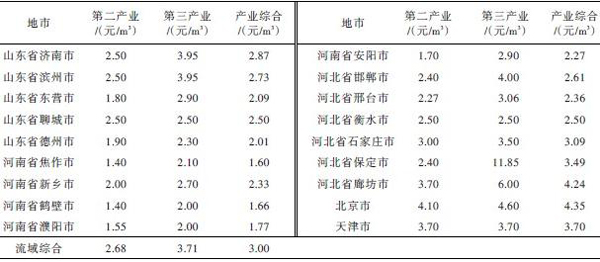 用户自备井等独立取水系统为住户自用系统,取水不进行交易,其生产成本本文不做评述;水库供水一般由水利(水务)主管部门管理,其建设、管理投入一般由国家承担,这部分供水的成本涉及到大量的投资及管理等资料,难以测算,由于国家投入可通过水资源费来体现,因此原水供水成本本文也不做详述。要测算海河流域自来水平均供水成本,需要对每个水厂进行成本分析,从资料可获得性来讲存在较大难度,目前自来水供水一般采用类似于市场化的管理模式,所征收价格在一定程度上能够反映其生产成本,本文收集了海河流域内的山东、河北、北京市和天津市的自来水水价资料,加权平均后作为海河流域自来水生产成本,为3元/m3,详见表4。