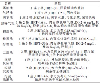 当废水中含油质量浓度>50 mg/L 时会严重影响生化处理效果,一方面由于活性污泥菌胶团表面黏附一定量的油,阻碍了微生物对氧的摄取,从而使污泥的生物活性和生化处理效果下降;另一方面,污泥表面黏附油后,整体密度减小,影响了活性污泥的沉降性能,易造成污泥流失。设置平流隔油池的目的在于去除水中的轻油和重油,平流隔油池水力停留时间为3 h。设置气浮池的目的在于去除水中的乳化油,气浮池停留时间为1.2 h。