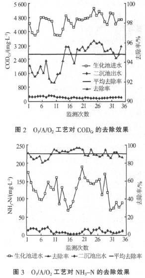 (3)O1/A/O2硝化反硝化生物脱氮处理工艺运行稳定,操作方便,耐冲击负荷强。在进水CODCr3 500~5 800 mg/L,进水NH3-N 36~285 mg/L 时,系统对CODCr和NH3-N 去除率分别达95%、89%以上。
