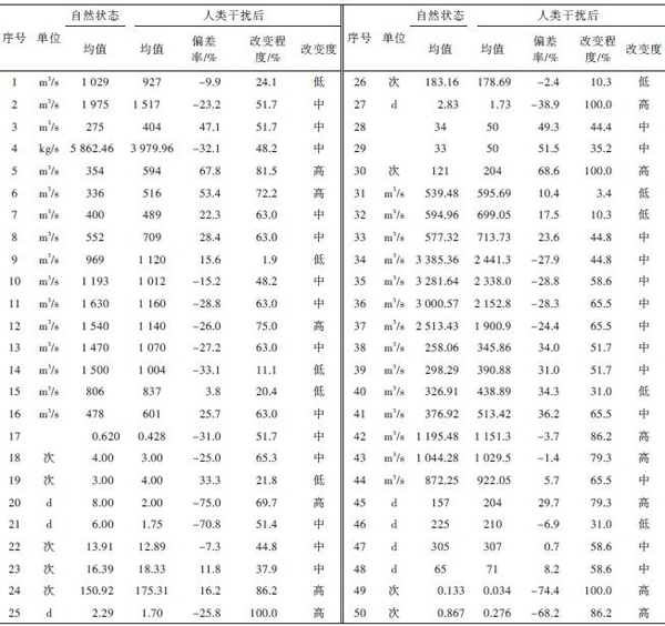 选用兰州断面日径流资料(1950—2004年)为基础资料。1950—1974年间由于兰州断面以上无大型水电工程,且人类活动较少,可近似认定为天然状态。之后的1975—2004年可认定为人类干扰期。应用YEHIS指标体系对人类干扰前后断面的水流情况进行RVA评估。评价结果如表4。