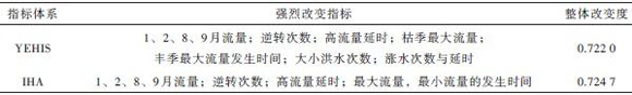为了评估YEHIS指标体系的效用,将基于IHA指标体系[17]的RVA评估结果与之对比(表5),发现应用YEHIS和IHA作为基础评价指标,所得到的整体改变度基本相同,强烈改变指标所涵盖的指标范围也基本一致,但略有不同。YEHIS的评估结果显示:①IHA结果中的最大流量变化主要分布在枯季,②除IHA 评估结果中列出的变异指标外,大小洪水、涨水次数与延时等水流特征也发生了强烈改变,③IHA 结果出现的最小流量发生时间在YEHIS中没有出现,这主要是由于IHA计算时采用日历年,1—4月份与11—12月份是分开的,发生时间落点分布于两区间时,时间跨度大,变化程度呈现强烈。而YEHIS 中,枯季处于一个区间中,相同的结果在YEHIS 中就较小。可见YEHIS指标可以更准确地反映评估结果。