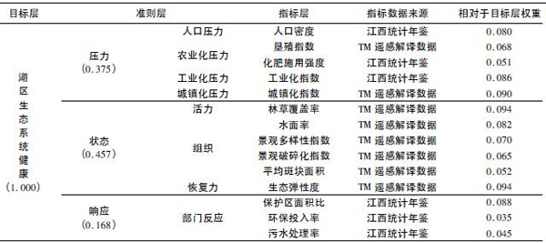 自然背景条件、人类开发利用活动和环境管理共同作用形成的结果(叶亚平等,2000).在生态系统健康研究历程中,研究者设计了多个评价指标体系的概念模型,其中以联合国经济合作开发署(OECD)建立的压力-状态-响应(P-S-R) 框架模型应用最为广泛.本文根据鄱阳湖区生态环境的特点及人类开发利用活动情况,依据整体性、代表性、可比性、可操作性和可定量化等指标选取原则,通过压力-状态-响应概念模型框架进行指标体系的构建.最终形成了具有目标层、准则层和指标层共3个层次14个指标的鄱阳湖区生态系统健康评价指标体系,具体如表1 所示.