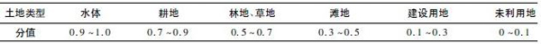 式中,ERES为生态弹性度,n为地类数,Ai是地类i 的覆盖面积(hm2 ) ; Ti为地类i 的弹性分值,可通过覆盖度、生产力或专家评分等方法获得,在此参考已有研究成果(高吉喜,2001; 张宝秀等,2008),并结合湖区实际情况进行确定,各地类的弹性分值如表2 所示.