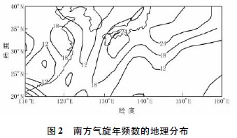 图2 给出了南方气旋多年平均年频数值的地理分布。可以看出: 南方气旋活动主要集中在我国东部沿海地区及日本南面的海面上,南方气旋频数区向南延伸比较明显,主要中心一个位于江淮流域,中心最大频数值为18,还有一范围较大的海上气旋活动区,位于日本列岛的南部,中心频数值大于24。与北方气旋不同的是,南方气旋活动主要集中在海上及沿海地区。