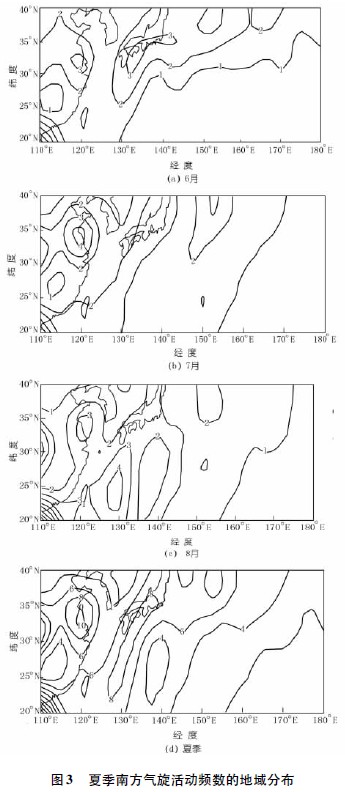 (2) 南方气旋活动频数的地域分布大致呈现出两块频数集中区,一个位于我国东部沿海,另一个位于日本南部的海面,由于夏季气旋活跃,其中7月份我国东部沿海气旋活动频繁,8月份日本南部海面气旋活动频繁。