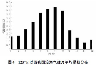 南方气旋活动的高频数区主要位于我国东部沿海的江淮流域以及日本南部海面,尤其在夏季,由于西太平洋副高较强向西伸展,在一定程度上限制了沿海气旋向海上活动。因此,和其他季节比较,夏季我国东部沿海的气旋活动最为频繁,东部地区夏季降水很大一部分为气旋带来的降水。图4 给出了125°E 以西我国沿海气旋月平均频数分布曲线。可以看出,沿海气旋频数最多出现在7月,其次为6月,因此夏季6、7月沿海气旋活动频繁。