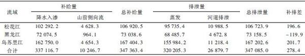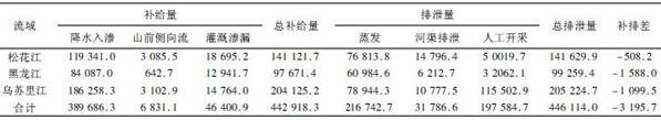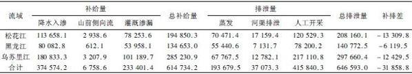 (1) 地下水自然循环阶段。在20 世纪50—60 年代,三江平原地广人稀,地下水基本未得到开发。地下水的补给项有降水入渗补给和山前侧向流,总补给量为34.74 亿m3 /a, 97.05%来自大气降水入渗补给; 地下水排泄项有地下水蒸发和河道排泄,总排泄量为34.71 亿m3 /a,地下水蒸发排泄量占92.26%(见表1) 。平原内部沼泽遍布,地下水位埋藏很浅,地下水主要消耗于蒸发。在没有人类大面积活动干扰的前提下,三江平原地下水交替较缓慢,黑龙江流域排泄量略大于补给量,而松花江和乌苏里江流域则恰好相反。综合全区来看,地下水处于平衡状态,地下水资源丰富,总补给量和总排泄量基本持平。这一阶段地下水完全受控于自然环境,地下水循环完全遵循自然规律。