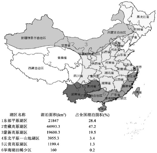 湖泊可以简单定义为四周陆地所围之洼地,与海洋不发生直接联系的静止之水体。然而湖泊也是一个以水面、湖岸带以及湖泊流域为区域,以水为纽带所构成的自然、社会和经济相互渗透的一个相当复杂的系统[1-2]。我国湖泊众多,形态各异,分布较为广泛,全国湖泊主要可以划分为五大湖区,见图1。