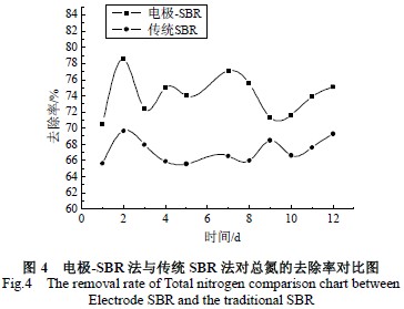 从图 4 的实验对比结果看,有加电极的SBR 反应器的总氮去除率比没有电极的SBR 的高,高出5 %~10 %。