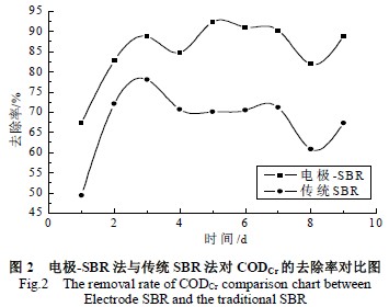 从图 2 的出水CODCr 的处理效率来看,加电极的生物处理比不加电极的一方略好。平均高出10 %~15 %。