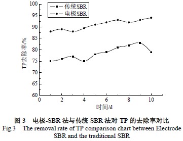 从图 3 可以看出,电极—SBR 法的去除率在85 %~95 %之间,传统SBR 法在75 %~80 %之间,从磷去除率来看,电极—SBR 法比传统SBR 法好。我们认为电极对磷的去除有一定的作用。同时从出水的磷的含量来看,硝酸盐氮的含量对微生物在厌氧时释放磷有一定的抑制作用。