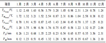 统计模式建立之后需要进行有效性验证。本研究利用1991—2004年观测值进行验证,检验的要素包括日最高气温均值(TDmax)、日最低气温均值(TDmin)、月最高气温均值(TMmax)、月最低气温均值(TMmin)、日平均降水量(PD)、月平均降水量(PM)。分别计算了12 个月各站点观测值的均方根误差。可以看出,气温的模拟效果比较好,气温各统计要素的模拟效果差别不大。其中,月气温模拟效果优于日气温模拟效果; 模拟均值的效果略高于模拟方差的效果。此外,夏、冬两季气温模拟效果明显好于春、秋两季,原因可能是春、秋季环流交替频繁,冷暖变化较大,气温模拟比较困难。而降水的模拟误差明显大于气温的。