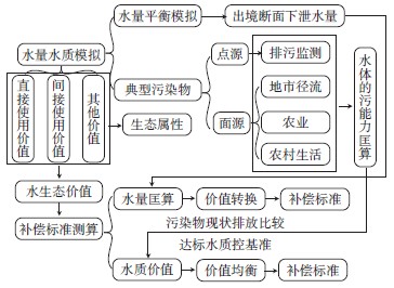 我国流域生态补偿研究始于20世纪90年代,主要集中在补偿主客体、措施、标准等方面,其中补偿标准的计算是实施生态补偿机制的关键。已有的流域生态补偿测算标准针对性强、通用性差,对水量水质联合属性考虑较少。国际上,Niksokhan等[1]针对污染的河流系统提出一种考虑利益相关者利益冲突的污染物排放控制方法;Mahjouri等[2]给出一种跨流域的水权转让理论方法;Jesus de Otoro给出核算由环境保护行为提高流域生产能力导致的机会成本方法[3]。水质招标或水质交易可以提供给土地用户更多的适应性的激励机制,印尼个案的研究作为首先使用招标机制来揭示费用支付的研究,为该机制在流域生态补偿标准方面的应用提供了新思路[4]。国内对流域生态补偿的研究一般借助对污染物实施的排放控制展开。曹国华等[5]的博弈模型、庞爱萍等[6]的基于水环境容量的流域生态补偿标准确定方法、卢艳等[7]的基于水质和污染物总量的流域生态补偿测算模型,均从一定程度上揭示了水质的好坏与生态补偿标准制定之间的潜在关系。徐大伟等[8]尝试性提出基于河流水质水量的跨行政区界的生态补偿量计算办法;许丽丽[9]以上游退耕还林农民的收益损失作为汉江流域生态补偿的下限;韩艳莉等[10]以“3S”技术为支撑,给出青海湖地区生态补偿的上下限。但在实践中,补偿方与受偿方对生态环境保护的投资及收益水平的估算依据不同,难以准确界定生态补偿标准。结合当前流域生态补偿实施中的共建共享理论[11]、经济最优理论[12],本文从水量水质属性出发,分类计算补偿标准;为实现流域合理用水、有序发展,永定河流域生态补偿标准测算框架见图1所示。水资源短缺、上下游用水矛盾突出、水环境恶化等问题的存在,使得流域生态补偿标准制定要有效益评价和具体的水量、水质要求。