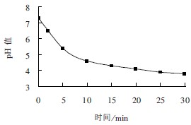 由图4 可知,溶液的pH 值随氧化时间的增加不断降低,从10 min 开始趋于平稳,整个过程中溶液pH 值在7.3 到3.8间,其原因可能为溶液中有机酸的生成导致溶液酸性增强。
