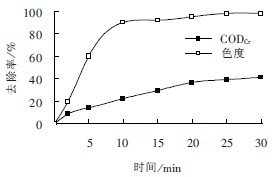 Fig.3 Influence of ozone oxidation time on CODCr and colority removal