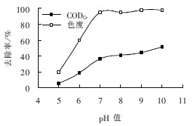 Fig.5 Influence of initial pH value on CODCr and colority removal