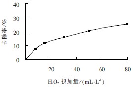 取5 份CODCr的质量浓度为1 200 mg/L 的水样,色度为6 250 倍,pH 值为7。分别向各水样中加入质量分数为3%的H2O2溶液0、10、20、30、50、80 mL/L,静置氧化处理30 min,水样色度均无明显变化。水样的CODCr去除率如图6 所示。