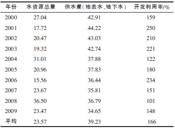 由于白洋淀流域经济社会快速发展,水资源开发利用程度加大。本次对白洋淀以上流域2000~2009年共10年的地表、地下水资源总量及实际地表、地下供水量进行统计分析,见表1。