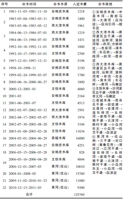 为维持白洋淀不干淀,自20世纪80年代至2006年有19年共22次,通过海河流域的王快水库、安各庄水库、西大洋水库和岳城水库,向白洋淀临时进行生态补水7.9亿m3,这些措施对维持白洋淀生态湿地功能起到了重要作用。在本流域无水补淀,白洋淀又面临干涸情况下,自2006年以来,又实施了跨流域调水工程。2006 ~2007 年、2007 ~2008 年、2009~2010 年和2010~2011 年连续4 次应急引黄济淀,大大改善了白洋淀生态环境。白洋淀历次补淀统计见表4。