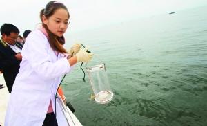 9月27日,环保人员在丹江口水库取水样。(记者 蔡代征/摄)