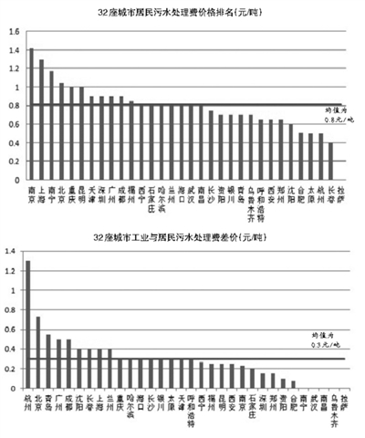 从32个城市居民污水处理费价格情况来看,均价为0.81元/吨(拉萨尚未开征污水处理费,均价未将其纳入),其中12个城市高于均价,19个城市低于均价。污水处理费最高的南京(1.42元/吨)和最低的长春(0.4元/吨)相差2.6倍。可见,我国各地污水处理费的标准差异很大。各城市间污水处理费排名,无论从人均水资源量,还是从经济发展水平观察,均没有规律可循。