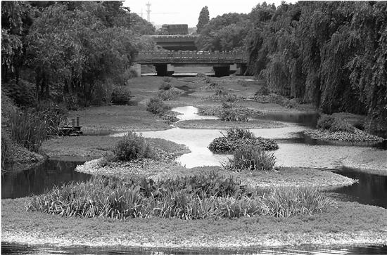 顺着老人指的方向望去,一只白鹭正在河面上飞翔。水中央有一个个大型的植物生态带,圆圆的形状,像一朵朵盛开在河中央的大莲花。“这些植物都是生态修复用的,有聚草、鸢尾、圆币草等等。”环保的工作人员说。