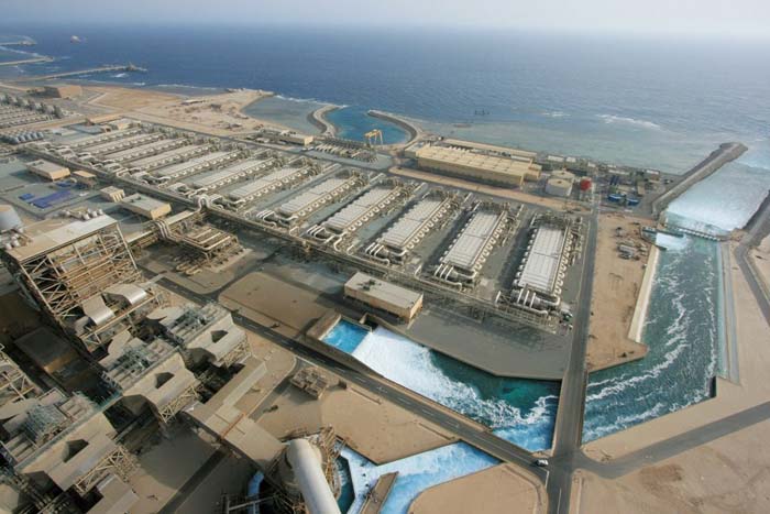 中东石油资源充足,海湾国家的淡化厂大多规模庞大,此为沙特阿拉伯的沙埃拜海水淡化厂俯瞰图。 来源:谷歌地球相册