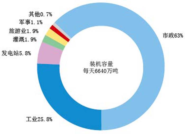 市政和工业用水各占了63%和25.8%,其余依次为发电站、灌溉、旅游、军事和其他用途。 来源:全球海水淡化数据库