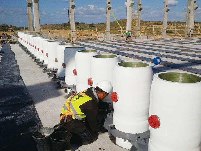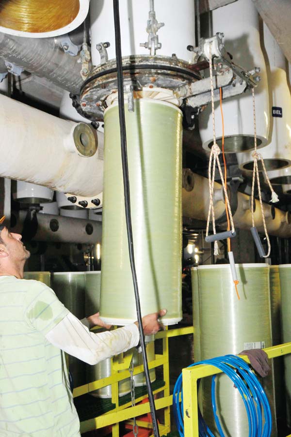 以色列的索莱克海水淡化厂采用了垂直地面的净水单元,单元里面是16英寸(约合40.64 厘米)淡化膜。垂直的设计不但可以减少支架的投资,还可以支撑更大规模的净水单元,传统的净水单元直径只有8英寸(约合20.32厘米),而垂直设计可以支撑直径16英寸的净水单元。每一个单元的净水量可以增加4.3倍。