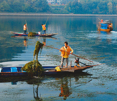 浙江建德,环卫工人清水草、护水质。(资料图片)